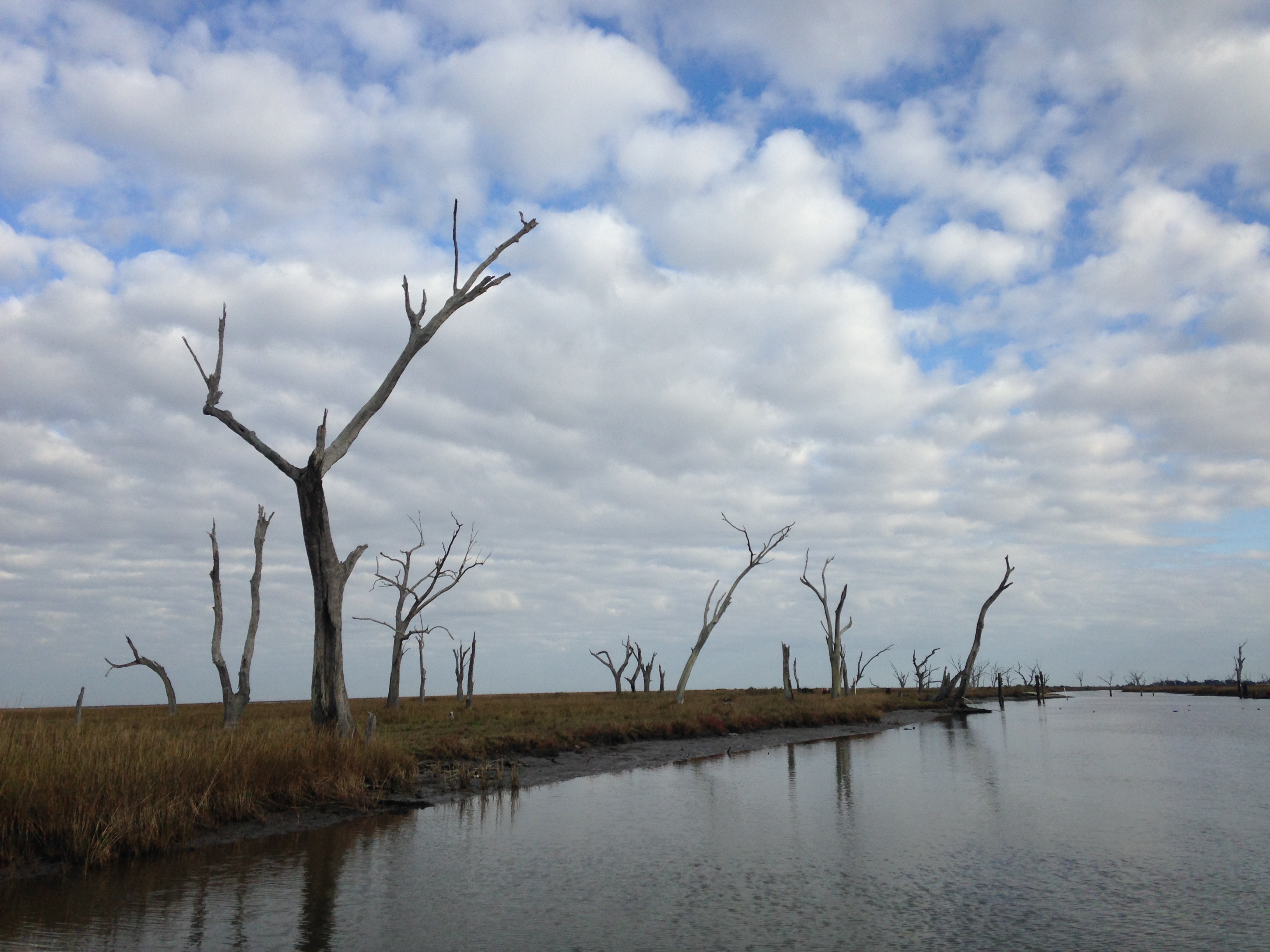 Dead trees covering enormous areas of the landscape are an unmistakable sign of an unhealthy, out-of-balance ecosystem.  White settlement in the 1700 and 1800s initiated efforts to prevent the river’s annual spring flooding with levees that cutoff the sediment deposits that created the land.  The concurrent elimination of freshwater river flow, in combination with an extensive canal network built for oil exploration and development, led to intrusion of saltwater from the Gulf of Mexico that killed the forests and trees that were poisoned by saltwater.