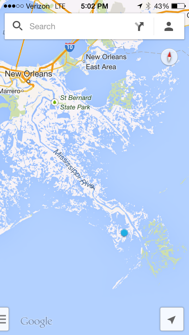 No where is land in Louisiana disappearing faster than between New Orleans and the mouth of the Mississippi River (the blue dot below is about as far south as we could drive the van) where maps are becoming increasingly blue at an astonishing rate, and few communities face as many challenges to their survival as the Grand Bayou Tribal Community.